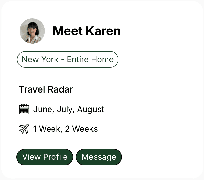 Hosts set their availability. Guests find matches for their dates. The system aligns on intent and compatibility.